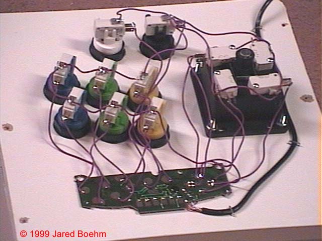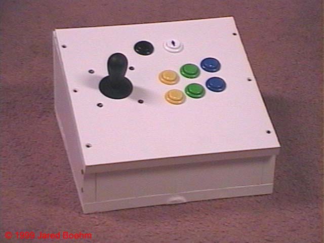 What you're looking at is a modified Super Nintendo Controller! It plugs into the connector I built for my parallel port and features 8 Happ Horizontal Microswitch buttons, (6 for the actual games, and 2 for start and coin,) and a Happ Super 8 joystick, (which I'm VERY pleased with I might add). The box and control panel are made from 3/4" shelving material that I found at Home Base for like $6. The cool thing is that I didn't have to cover it with anything! I'm in the process of building another one of these contraptions so that two people can play, or you could stick them side by side for 2-joystick games. The connector I built for the parallel port supports up to 5 SNES pads so maybe down the road I'll build a couple more for some serious Simpson's action!