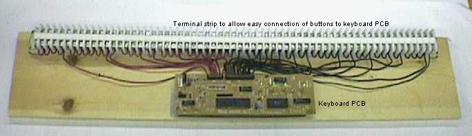 motherboard. After soldering the wire to the PCB, I decided to mount my keyboard PCB to a piece of pine along with a din rail and terminal blocks. I used the metal mounting plate that the PCB was originally mounted in the keyboard case to mount it to the wood so it was really easy. All I had to do was cut the metal down a little and drill mounting holes through it and I was ready to fasten it to the wood. The reason I decided to mount the PCB to the separate pine rather than the joystick box in case I ever wanted to change the location of the PCB in my cabinet someday when I build one. I used the terminal blocks so I could easily make button changes if needed and not worry about soldering wires. It works great! Here's the PCB and terminal blocks mounted to the wood.