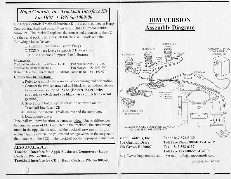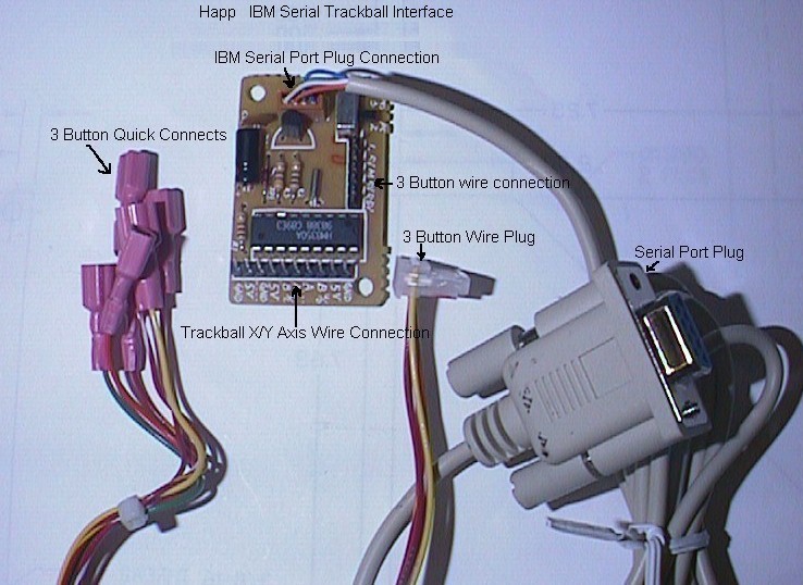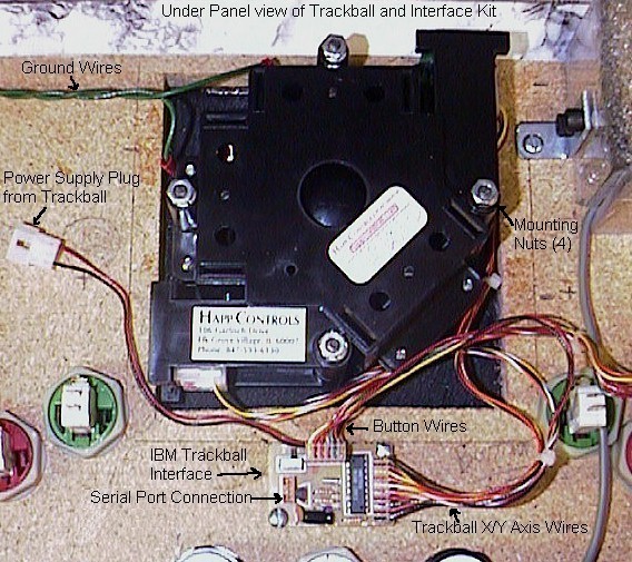 After everything is mounted, the next thing that needs to be done is the wiring. When I received the trackball, I noticed that it had two earth ground wires on it. This presented a problem for me since I didn't have a nice place in my panel to attach them. I called Happ Controls tech support and asked them if I needed it. They said that in hot and dry areas, the trackball discharges some static and that I should really use the ground wires. Ok, so I had another problem to solve. What I did was solder a longer wire to the two ground wires and put an alligator clip on the end. This allowed me to run the ground wire out of my panel, down the chord for the keyboard and clip it right to the frame of the computer, which gave me the ground. I'm planning on doing this when I build my cabinet too. Simple yet effective. Next comes hooking the power supply, serial plug, trackball, and buttons to the interface. This is very easy since all you need to do is follow the simple diagram that Happ provided with the interface kit shown here.You will need to switch the wires that come with the trackball to do this, but those are also provided in the kit.