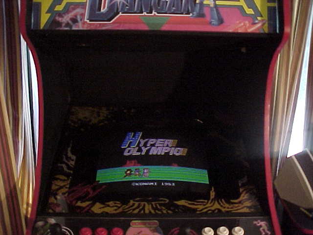 On the left, you see Hyper Olympic, a horizontal game playing on the 20" monitor.  On the right is Gunsmoke, played vertically... It took Gerald about 15 seconds to rotate the monitor!