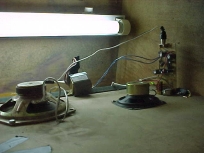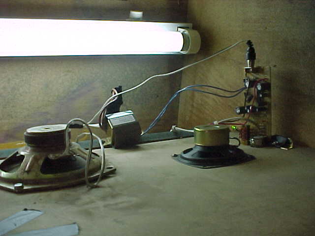 The speakers were cheap computer speakers, completely disassembled.  Notice that the PCB of the amplifier is stuck on the wood, and the audio controls can be used from the other side.  Also, Gerald used a fluorescent lamp to illuminate the top marquee.