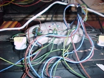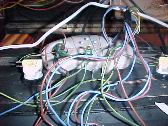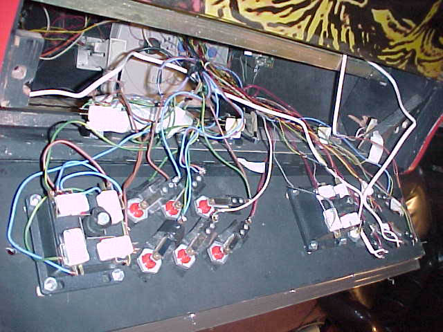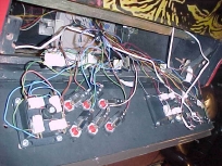Spaghetti time.  This is a shot of the underside of the control panel.  Notice leaf based pushbuttons, which Gerald prefers over microswitch.